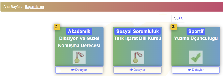 İş hayatında görürsünüz. Meslek insanlarının ofis duvarlarında sertifikaları sıralanmıştır. “Şu kadar kursa katıldım. Şuradan belge aldım. Şöyle bir başarı sergiledim.” Hepsi belgeli, sertifikalıdır. Kurumların, başarı köşeleri, madalya/kupa dolapları oluyor da, öğrencilerimizin neden olmasın? “Bir öğrencinin kütüğüne, öğrencilik hayatı boyunca elde ettiği başarıları – ödülleri – sertifikaları işlesek, hatta bu başarıya giden yolda resim – doküman ve belgelerini de, bu kayıtlara eklesek nasıl olur?” diye düşündük. Öğrenci portalında “Başarılarım” diye bir bölüm hazırladık. Her bir başarı konusunun içerisine; açıklama, kişi-şube-sınıf-okul başarısı açısından derecesi, başarılı olunan alan, rozet varsa resmi ve konu ile ilgili ne kadar doküman/ belge varsa eklenmesi sağlanmıştır.