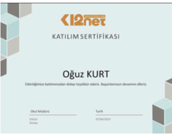 Aşağıdaki ekran görüntüsüne bakınız. İstediğiniz konuda, istediğiniz görsellikte, K12NET üzerinden sertifikalar üretip, ürettiğiniz bu sertifikaları, öğrencinin başarıları bölümünde depolayabilirsiniz. Bu çalışmanın en önemli özelliği en sevdiğiniz renk, en sevdiğiniz görsellik, en güzel kompozisyon, hepsinin size özel olarak hazırlanabilmesidir.