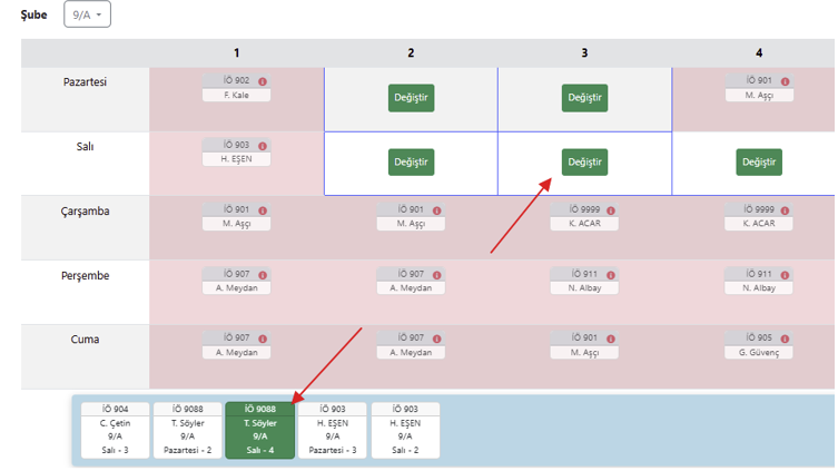 Bir başka senaryoda birkaç öğretmen vardır. Genele dokunmadan bu bir kaç öğretmen üzerinde çalışma yapılabilir mi? Bunun için bütün öğretmenlerin programların görüldüğü çarşaf bir listeye ve nereye hareket ettirebileceklerine kılavuzluk eden çizelgelere, renklere ihtiyaç vardır. K12NET, tam olarak bunu yapıyor.